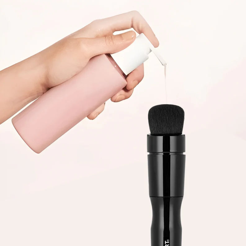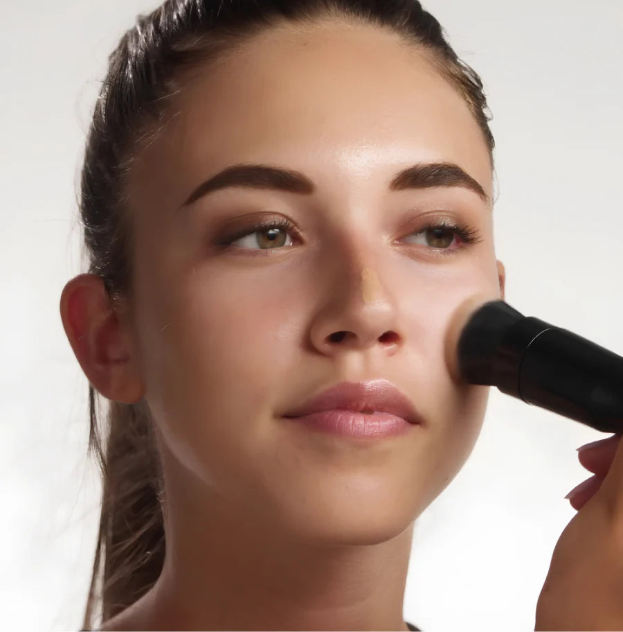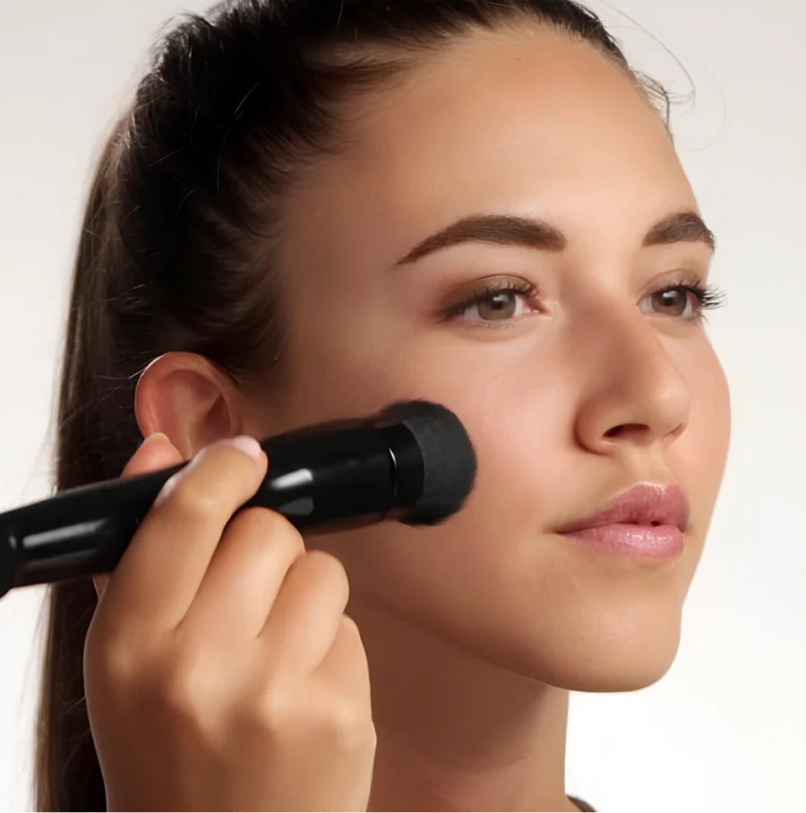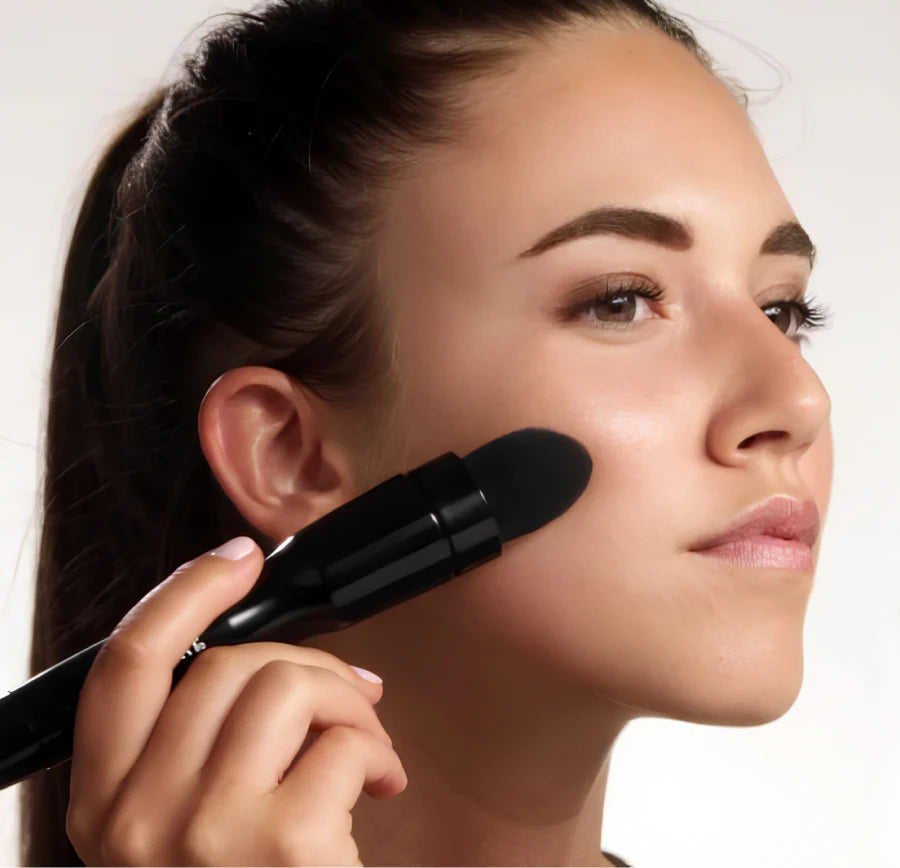 You can use it with liquid, cream, or powder makeup—including foundation, blush, contour, and highlighter. Just choose the right brush head for each product.